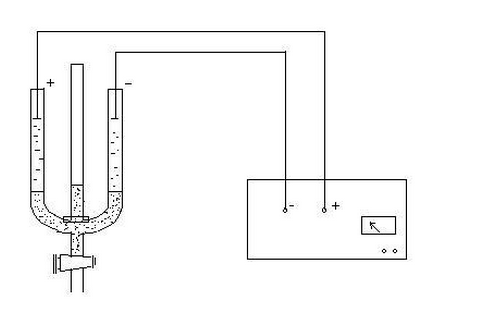 本實驗是采用宏觀電泳法來測定ζ電勢。宏觀法是觀測膠體溶液與另一個不含膠粒的無色導電溶液的界面在電場中的運動速度。對高度分散的溶膠(如Fe(OH)3溶膠和As2S3溶膠)或過濃的溶膠,只能用宏觀法。測定裝置如下: