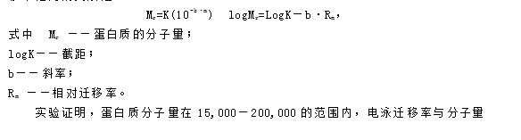 的對數之間呈線性關系。蛋白質的相對遷移率Rm=蛋白質樣品的遷移距離/染料(溴酚藍)遷移距離。這樣,在同一電場中進行電泳,把標準蛋白質的相對遷移率與相應的蛋白質分子量對數作圖,由未知蛋白的相對遷移率可從標準曲線上求出它的分子量。