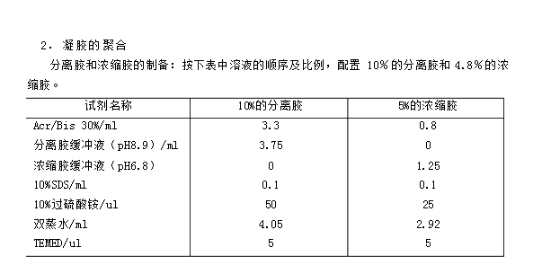 2)30%凝膠貯備液:丙烯酰胺(Acr) 29.2g,亞甲基雙丙烯酰胺(Bis) 0.8g,加雙蒸水**100mL。外包錫紙,4℃冰箱保存,30天內使用。