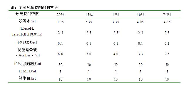 5)電極緩沖液(pH8.3):SDS lg,Tris 3g,Gly 14.4g,加雙蒸水溶解并定容到1000mL。4℃冰箱保存。 6)10%SDS,室溫保存