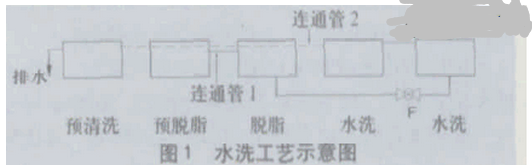 如圖1所示,要做到合理用水一般在預脫脂槽、脫脂槽之間有連通管l外,在預清洗和水洗槽間增加連通管2,并保持水洗槽的液面高于預沖洗槽的液面。在水洗槽循環管路上增加一個引水支管,通過閥門F控制,可以將水洗槽內的水加到脫脂槽內。僅在**后一道水洗槽配備自來水加水管,撤消其它槽上的自來水加水口。通過閥門控制可以用水洗槽內的水補充脫脂槽,或經脫脂槽補充到預脫脂槽(脫脂槽液因高溫蒸發和工件消耗攜帶而減少),也可以用來配制脫脂槽溶液,沖洗預脫脂槽和脫脂槽。日常靠水位高度差通過連通管2補充預清洗槽所需要的清洗水,并經預清洗槽排放,完成水的多重循環利用。