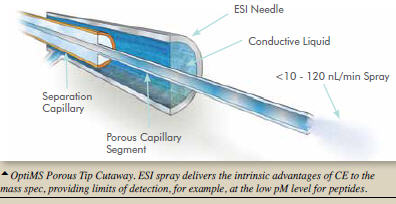 CE與其極性和帶電荷的分析物,如代謝物,堿性藥物和肽一起工作。其分離完全蛋白,高度帶電的肽和非常難以解析的蛋白復(fù)合物的能力將提供LC-MS不容易實(shí)現(xiàn)的新信息。傳統(tǒng)上,CE-MS已經(jīng)使用同軸噴霧器進(jìn)行,其添加鞘液和霧化氣體以實(shí)現(xiàn)穩(wěn)定的ESI噴霧。這種同軸的“三管噴霧器”設(shè)計(jì),雖然功能,導(dǎo)致樣品稀釋和信號(hào)減少。Beckman Coulter的新型CESI 8000高性能分離-ESI模塊與OptiMS技術(shù)提供了**商業(yè)無護(hù)套CE-MS噴霧器,為研究人員提供了一個(gè)強(qiáng)大的高靈敏度接口,利用高效,低流速的CE分離。