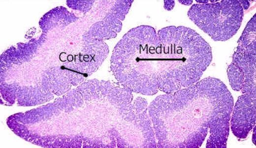 胸腺是 T 細胞發育和成熟的場所。它是一個扁平的雙葉器官,位于心臟上方。胸腺外部覆蓋有一層囊層,內部分為小葉,小葉通過稱為“小梁”的結締組織相互連接。每個小葉分為兩個隔室。外室或皮層密集地擠滿了稱為胸腺細胞的未成熟 T 細胞,內室或髓質與皮層中的胸腺細胞網絡相連。