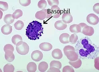 嗜堿性粒細胞是具有葉狀細胞核和顆粒狀細胞質的細胞,只能被亞甲藍染色,亞甲藍是堿性的。這些細胞占白細胞總數的不到 1%。嗜堿性粒細胞是非吞噬細胞,但積極參與過敏反應。顆粒狀細胞質釋放的藥理活性物質在某些過敏反應中起重要作用。